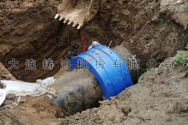 營口地區一地下承插排水管線洩漏,DN1200,一端鋼管,一端螺旋焊管,中間有1米6高度的法蘭盤。年久管道,螺旋焊管一端有變(biàn)形,並(bìng)且兩個管有錯位不同心。選擇承插口全包修補器,完成修複。