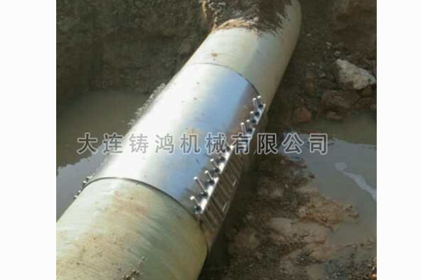 江西萬安縣,工程隊在施工時将一個外徑爲624mm的地埋玻璃鋼管挖破,漏點較小沒有察覺,過瞭(le)幾天施工時,再次挖破同一條管道,這次出現較爲明顯的漏水現象,挖開後發現,此管道上有兩處漏點,使用備(bèi)貨庫存兩套萬能片無限延長修補器進行修補。1個小時後順利完成修複。