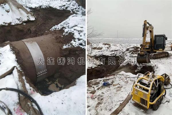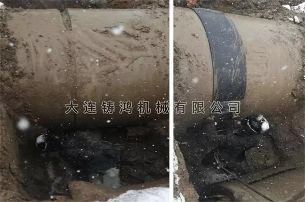内蒙水務DN1600mm的水泥管道(外徑1926mm)發生破裂,破損管道東側(cè)還有一趟雨水管道,開挖難度大,使用鑄鴻雙卡管道修補(bǔ)器進行快速修複。