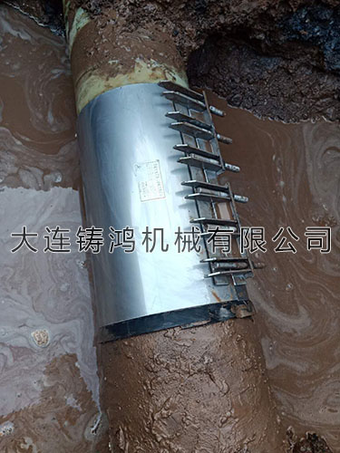 由於(yú)現場情況緊急,需要馬上恢複,但是需要修補(bǔ)的管徑沒在315-325這個範圍内,我司建議客戶在漏點位置墊一塊膠皮或者鋼闆,再安裝修補(bǔ)器,保證管道堵漏後的密封效果。
